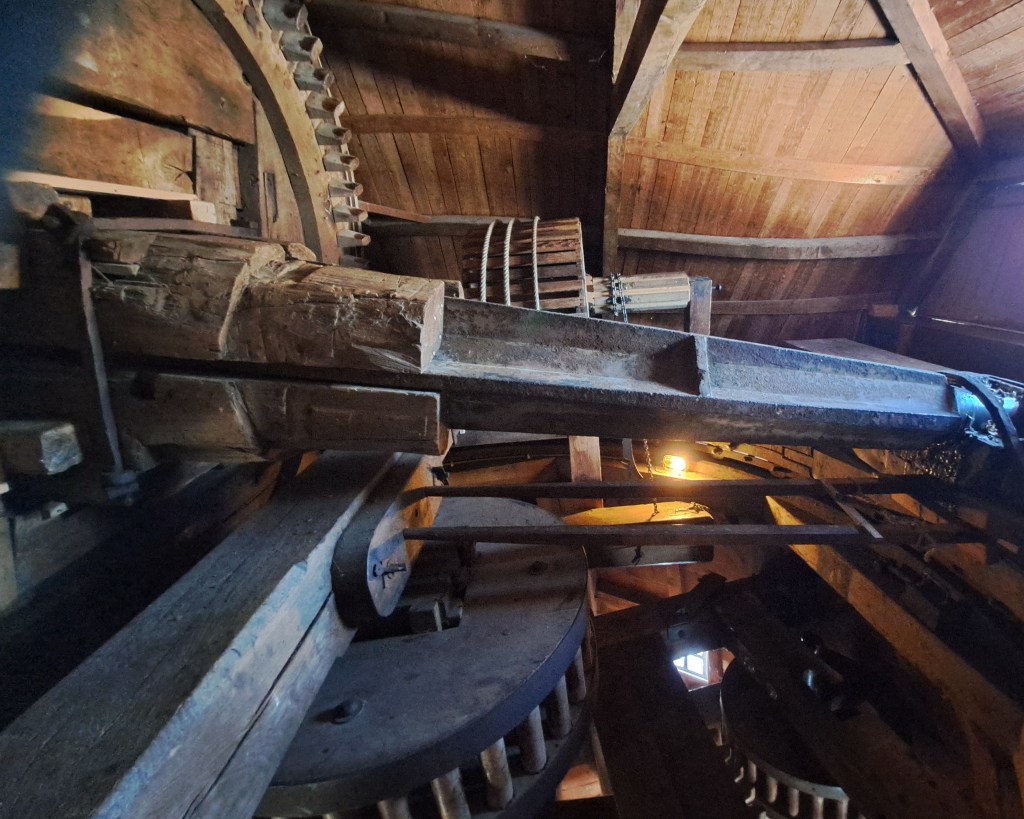 De wieken laten de bovens draaien, die in de kap van de molen een groot houten tandwiel heeft, het zogenaamde bovenwiel of vangwiel. Dit wiel drijft de steenspil aan die de molenstenen doen draaien, die een etage lager liggen: