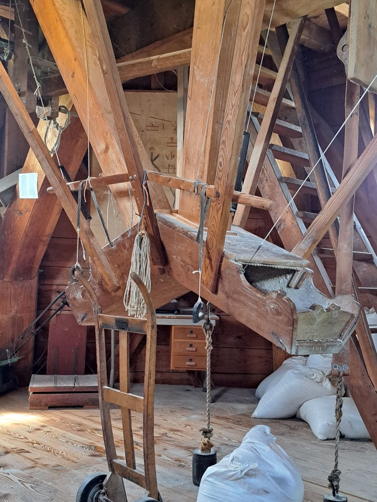Nadat het graan tussen de molenstenen gemalen gaat het door de meelpijp een etage lager en wordt daar opgevangen en weer in meelzakken gedaan.